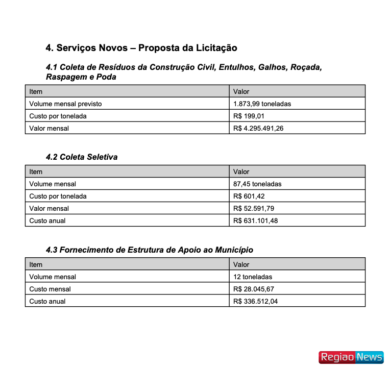 O edital também incorpora serviços inéditos, como a coleta de resíduos da construção civil, galhos, roçada, raspagem e poda de árvores, com custo estimado de R$ 199,01 por tonelada, para um volume previsto de 1.873,99 toneladas por mês. O serviço vai custar ao contribuinte R$ 4.295.491,26 por ano, uma fatura mensal de R$ 357.957,60 (R$ 191,01 por tonelada).