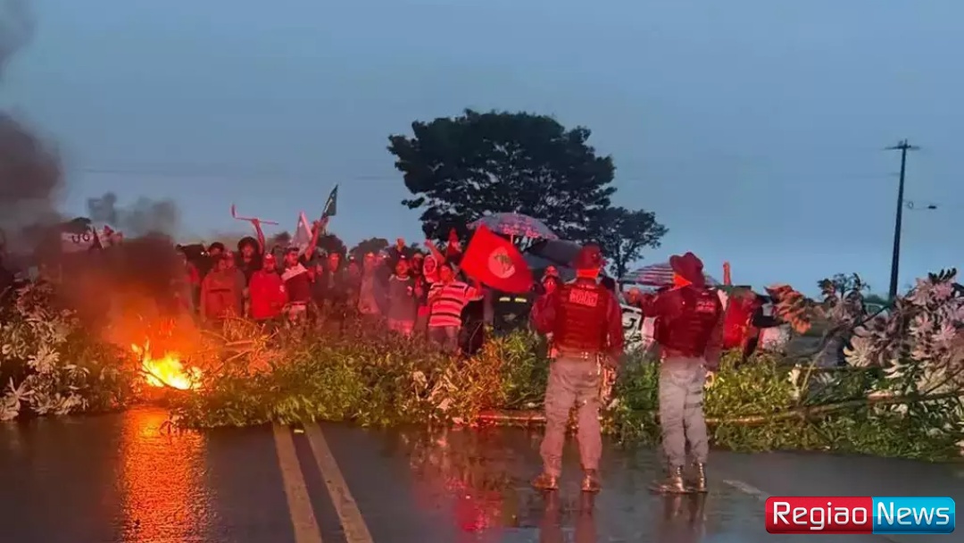Em imagens do local, é possível ver que os manifestantes utilizam galhos de árvores e ateiam fogo para bloquear a rodovia, impedindo totalmente a passagem de veículos.