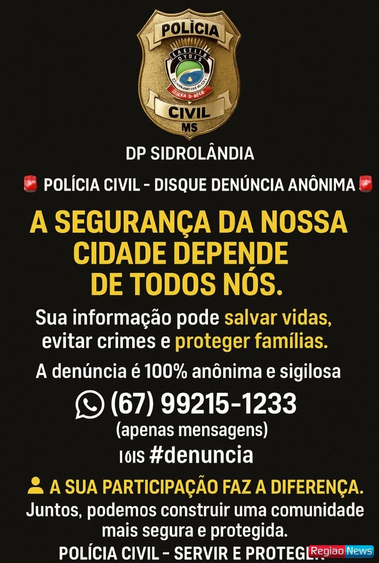 A Polícia Civil de Sidrolândia ampliou os canais de comunicação com a população e passou a disponibilizar um número exclusivo para denúncias anônimas via WhatsApp. A ferramenta tem como objetivo aproximar a comunidade da instituição e fortalecer o combate à criminalidade.
