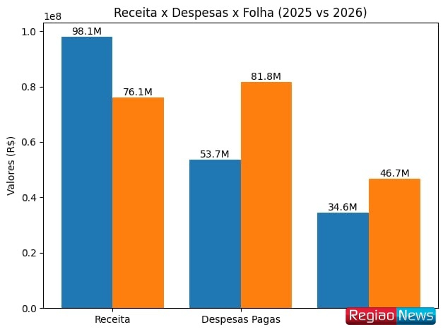 Enquanto a arrecadação recuou, os gastos do município cresceram de forma significativa. As despesas pagas saltaram de R$ 53,6 milhões em 2025 para R$ 81,7 milhões em 2026. Já as despesas liquidadas passaram de R$ 58,5 milhões para R$ 93,1 milhões no mesmo período.