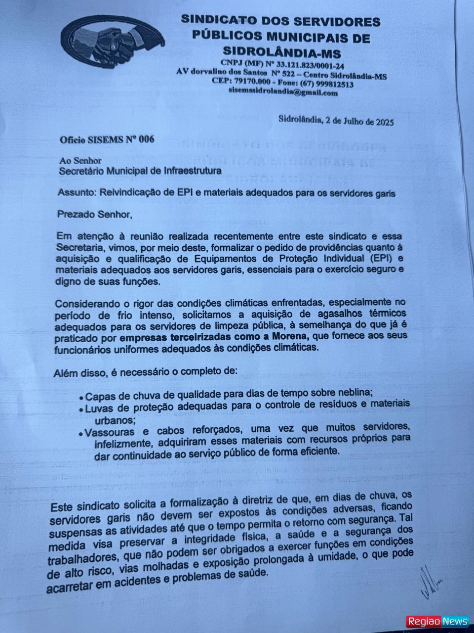 Após denúncias feitas por servidores da limpeza urbana de Sidrolândia sobre a falta de Equipamentos de Proteção Individual (EPIs) e materiais básicos de trabalho, a Prefeitura se manifestou por meio de nota oficial negando as irregularidades. Os garis relataram que estariam atuando sem luvas, capas de chuva, agasalhos e até vassouras, tendo que arcar com parte desses custos por conta própria.