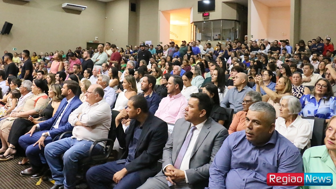 Na noite desta quarta-feira (18), a Câmara Municipal de Sidrolândia foi palco da solenidade de diplomação do prefeito Rodrigo Basso, da vice-prefeita Cristina Fiuza e dos 13 vereadores eleitos nas eleições de outubro. O evento, realizado no plenário Adenildo Amaral Lacerda, contou com grande participação popular. Para acomodar o público, uma estrutura com tenda e painéis de LED foi montada na área externa da Câmara, permitindo que todos acompanhassem a cerimônia.