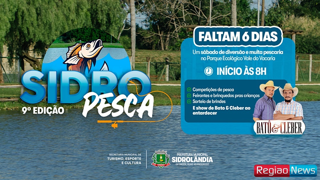 A 9ª edição do Festival de Pesca Sidropesca acontece no próximo sábado, 15 de novembro, no lago do Parque Ecológico Vale do Vacaria, em Sidrolândia. O evento contará com 324 participantes, atividades para crianças, sorteios de brindes e o show especial de Bato & Cleber ao entardecer.